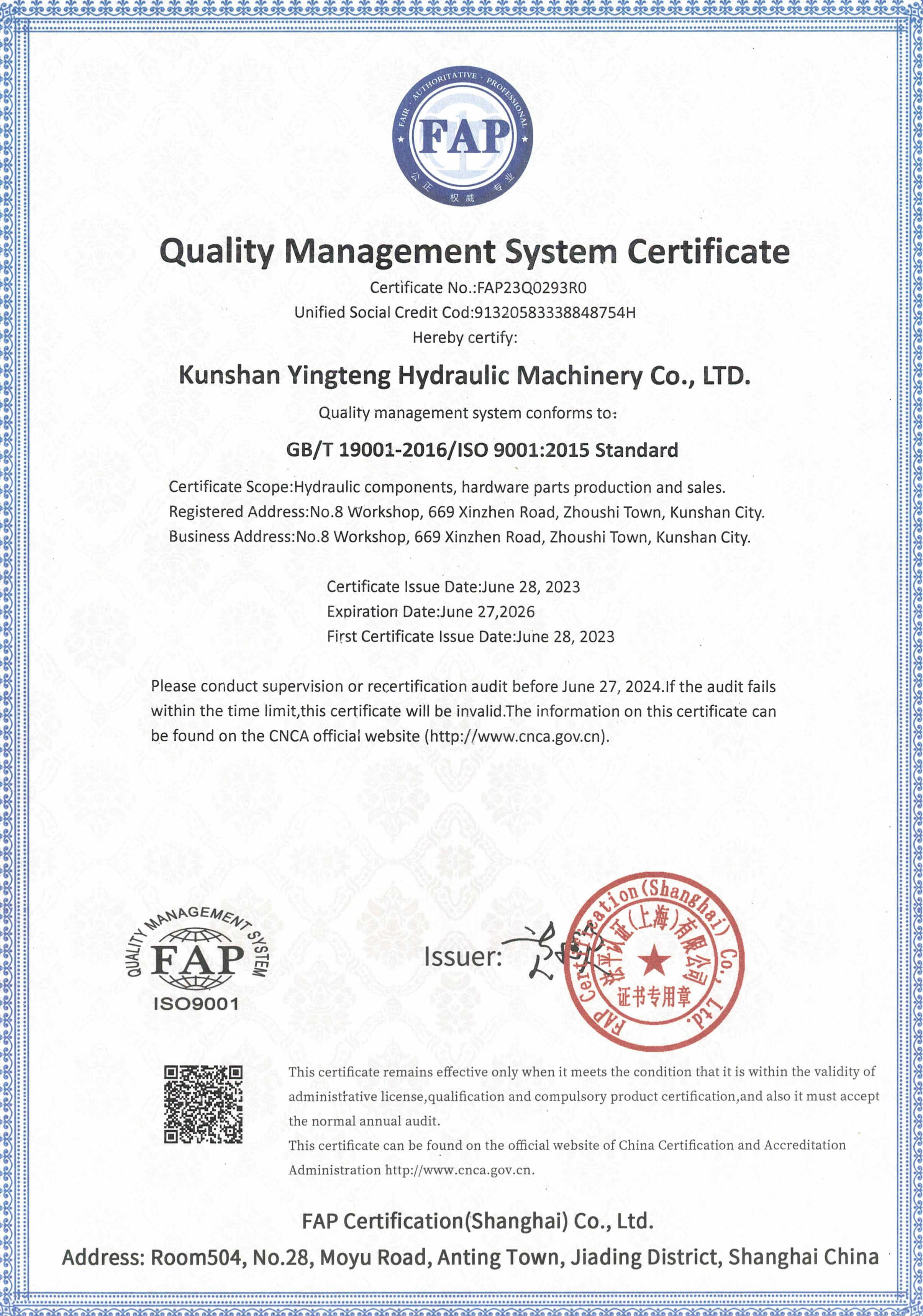 Kunshan Yingteng Hydraulic Machinery Co., Ltd. is a Taiwan-funded enterprise, founded in 2015, located in Kunshan Jinxi Economic Development Zone, formerly Taiwan Yingteng Company was founded in 2001, Yingteng company is a set of hydraulic cylinder, mold parts, metal products, mechanical equipment research and development and manufacturing as one of the high-tech enterprises. All along, we have been adhering to the quality policy of "quality as the center, excellence", and dedicated to provide high-quality products and efficient services for domestic and foreign customers. At present, Yingteng brand has become a trusted and preferred professional brand for domestic and foreign customers.